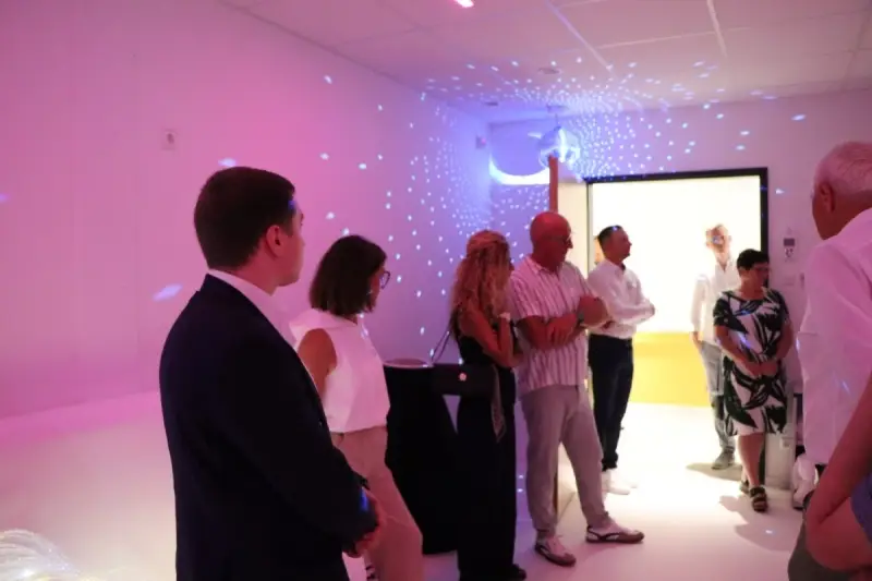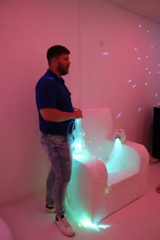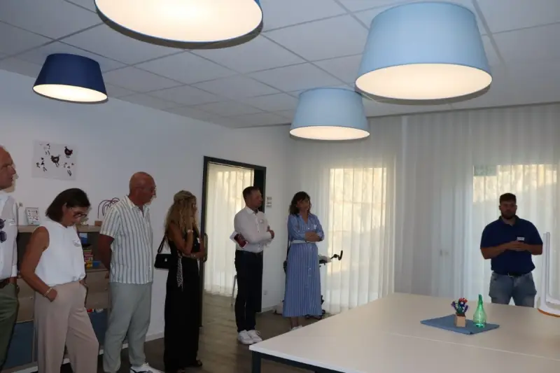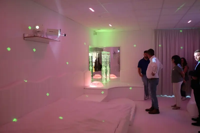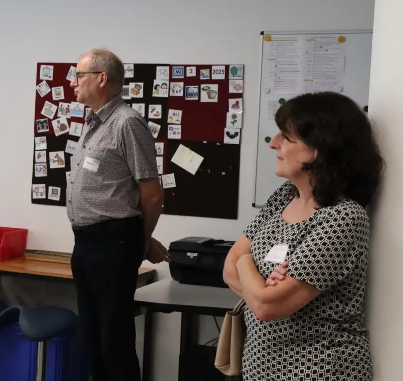 Höhepunkt der Besichtigungstour stellte der Rundgang durch die fünf Ebenen des neuen, modern ausgestatteten Birgitta-Hermle-Hauses dar: Ende des Jahres wurde der Neubau bezogen mit Tagesbetreuung für 30 Personen sowie 36 Wohnmöglichkeiten in Appartements oder Wohngemeinschaften – mit dem Zusatzangebot der Pflege. Denn: „Auch Menschen mit Behinderung werden älter“, erfuhren die Gäste und staunten über die geschmackvolle Einrichtung der Wohnbereiche und der Tagesbetreuung, besonders über den „Snoezeln-Raum“, den Sinnesraum mit den Elementen Wasser, Musik, Licht.