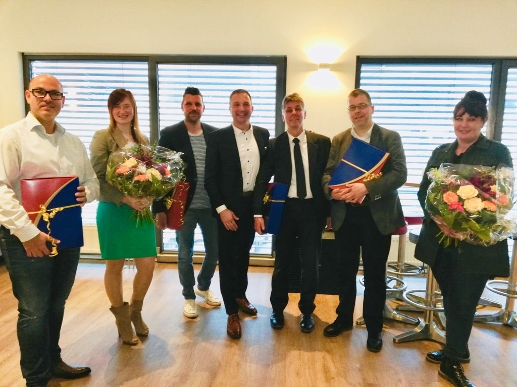 Vlnr: Franc Kosi, Irene Kindsvater, Jörg Sutter, Holger Huber, Gerd Rettkowski, Dirk Heinisch, Cathrine Gebel. In den Räumen der ADTV Tanzschule Maxxdance fand am vergangenen
