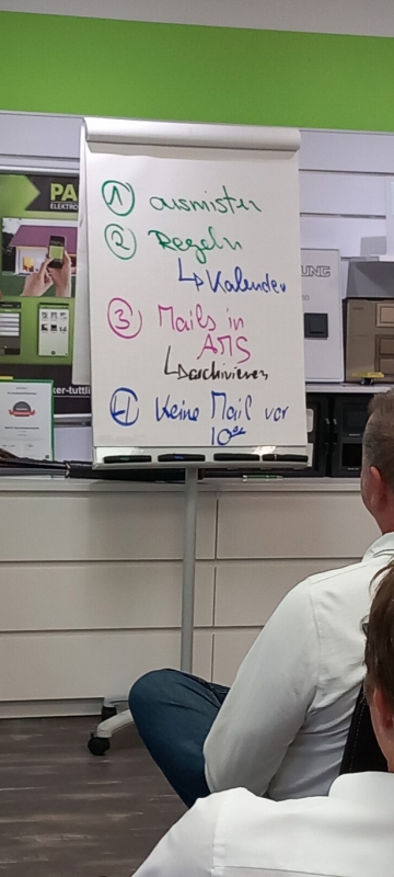 Ein Schlüsselkonzept, das Müller betonte, war die Unterscheidung zwischen nützlichen und eher störenden E-Mails. Um den Arbeitstag ohne Ablenkung zu starten, empfahl er, E-Mails erst nach 1-2 Stunden zu öffnen und vorher kreative Aufgaben zu erledigen. Des Weiteren betonte er die Vorteile, E-Mails in Unterordnern zu sortieren, die dann an bestimmten Tagen in der Woche systematisch bearbeitet werden.